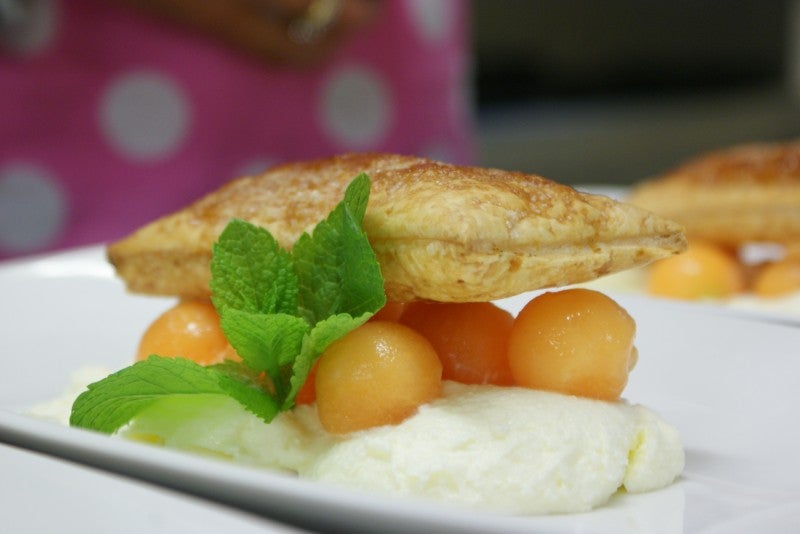 Spuit 2 lijntjes citroencrème op het bord. Leg hierin 2 rijen meloenbolletjes. Spuit hierop weer wat citroencr`me en dek af met het bladerdeegdakje.